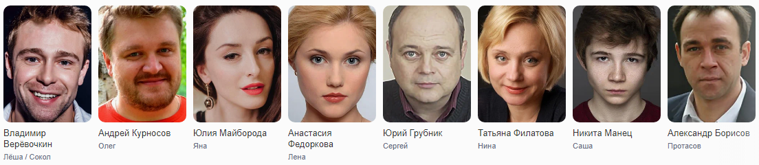 Все актеры: Александр Сластин, Сергей Воробьёв (4), Дмитрий Лавров (3), Яков Шамшин, Дарья Ленда, Артем Руденко, Петр Журавлёв, Олег Хамитов, Светлана Питерская, Александр Лазарев (3), Алла Еминцева, Александр Колесник, Юлия Чесняк, Юрий Уткин, Владислав Шкерин, Василий Игнатич, Владимир Михайлов (4), Юрий Жаравин, Олег Курсачёв, Леонид Паранин, Денис Шленков, Стэнли Красовицки, Илья Кирпиченок, Артем Васильев (4), Алексей Синицин, Юрий Петров (4), Дмитрий Пиличев, …
