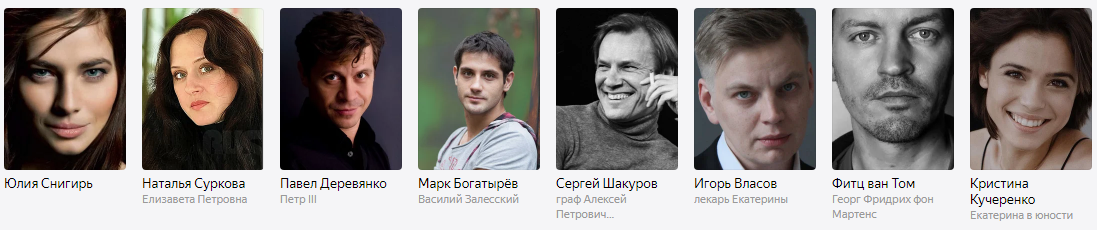 На роль Екатерины Великой пригласили молодую актрису Эль Фаннинг. Деспотичного и любвеобильного супруга императрицы Петра III сыграл Николас Хорт.